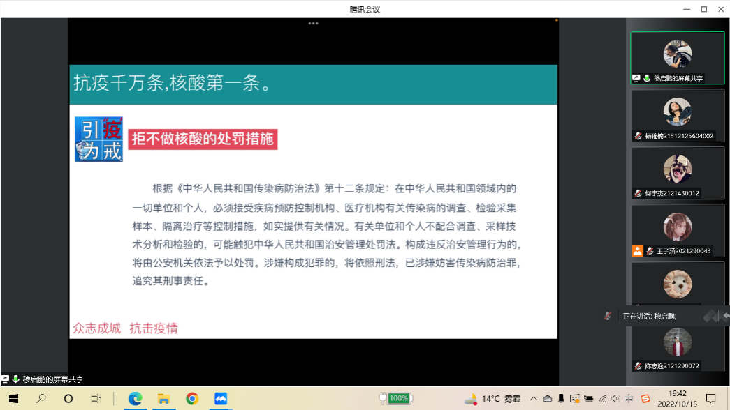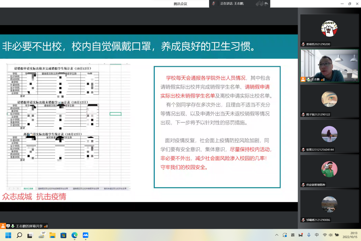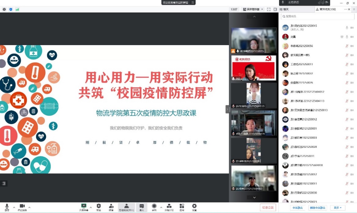学生党支部通过腾讯会议形式分支部由各专业党支部负责辅导员主讲开展第五次疫情防控“大思政课”宣传教育活动,党支部纵向管理下的各个本科生班、研究生班组全体学生参加了本次宣传教育活动。