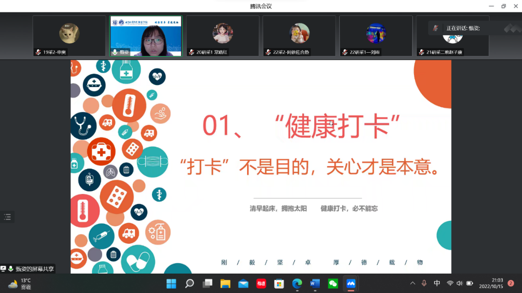 首先,各专业党支部负责辅导员详细介绍了每日健康打卡以及常态化核酸检测的作用和意义。当下疫情不断反复,通过每日健康打卡,可以让学校、学院更好的掌握学生实时健康动态、所在区域风险等级,以便学校相关部门更快、更好、更科学的研判,制定出相应的防控政策。而开展核酸检测有助于及早发现并控制疫情的传播扩散,从而及早的采取隔离和治疗措施。对于学校此类人员众多的密集场所,更应严格开展常态化核酸检测,既是为自己的健康安全负责,也是为全校师生的健康安全负责。