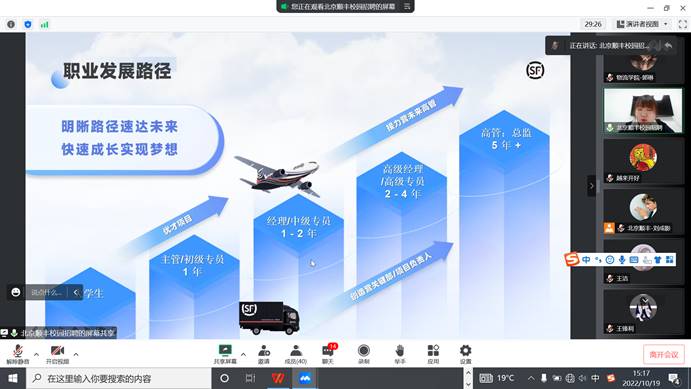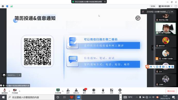 北京顺丰速运有限公司重视人才培养,学生实习期间有专人管理和辅导,实习表现优秀的学生将有机会优先签约进入公司。40位同学参加了线上宣讲会,并就上班时长、薪酬待遇等具体问题向张玲女士提问。