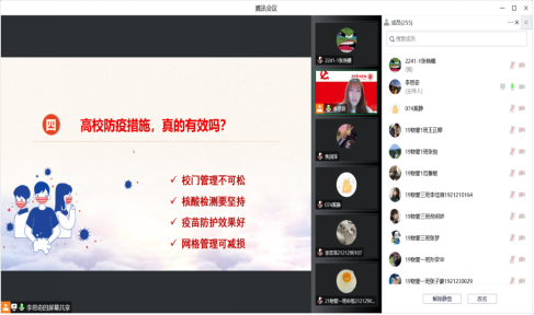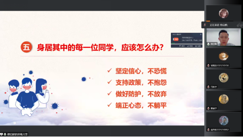 最后,各位党支部书记号召同学们坚定信心,不恐慌、支持政策,不抱怨、做好防护,不放弃、端正心态,不躺平,新冠病毒疫情的防控不是政府的独角戏,而是我们所有社会成员,乃至全人类共同都要参与其中的斗争。因此对于同学们来讲,做防控参与的有为人,首先就要积极配合学校的各项疫情防控政策。健康监测、居家观察、集中隔离、定点救治,不同的措施势必会对个人权利造成影响,公与私的矛盾需要我们理解和配合,切实承担起防控责任。