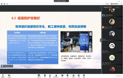 紧接着,针对部分同学可能认为的“快三年了,高校防控政策一‘严’不变”的问题重点做了解答。借助于大量科学研究数据,向同学们介绍了疫情发生以来,病毒毒株不断发生着变化,新冠病毒也愈发“狡猾”,而伴随着病毒的不断变化,国家的疫情防控政策也不断进行着调整,《新型冠状病毒肺炎防控方案》从第1版到第9版,以及2022年11月11日最新的优化疫情防控20条。与此同时,高校也根据上级的政策,不断优化校园疫情防控部署:全力以赴恢复和保障学校复课开学,精心组织学生返校;做好线上教学资源备份,做到“停课不停教” 、“停课不停学”;高度重视校园食品安全,从源头把控风险,为学生提供高质量餐饮;不断优化校园管理,满足校园封闭期间学生的正常需求。