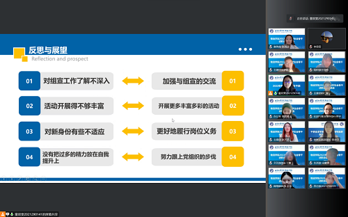 首先,由主席团成员进行述职报告,本学期,在大家共同努力下完成了一系列学生工作—如副部换届、暑期社会实践、筹备迎新工作、开展二级团校课、部门招新、组织新生活动、校学代会工作等。活动的成功举办离不开主席团及各部门的默契配合、团结协作。各位主席团同学从常规工作、组织学院活动等方面对分团委学生会的工作进行整理汇报,并对自身工作进行反思总结,提出自己任务工作执行、分管部门中存在的问题,并提出相应解决措施及进一步打算,要在未来不断强化青年干部的引领力,凝聚学生力量。