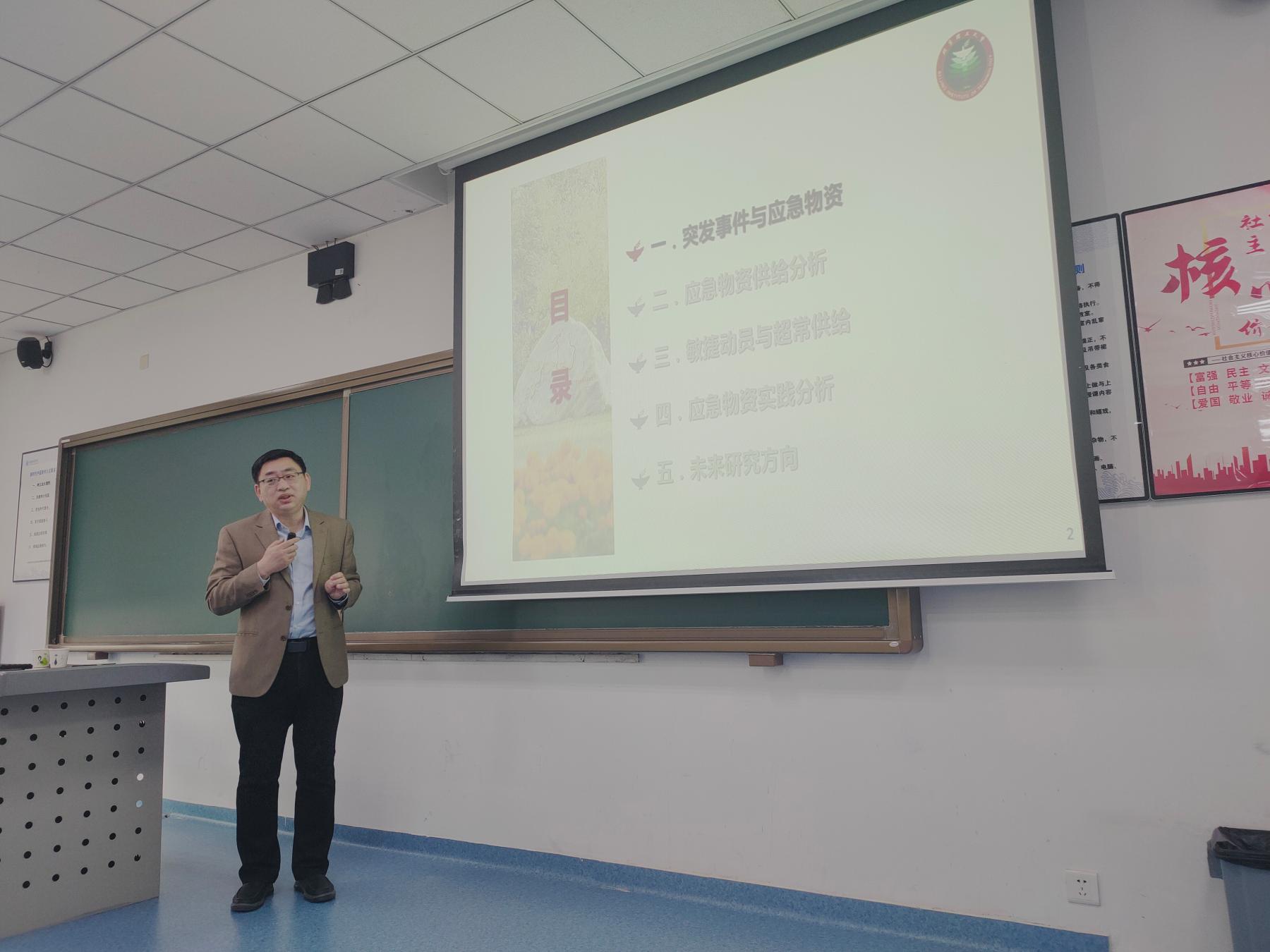 本次讲座中,张教授主要围绕“突发事件与应急物资、应急物资供给分析、敏捷动员与超常供给、应急物资实践分析和未来研究方向”五个方面进行了详细介绍。