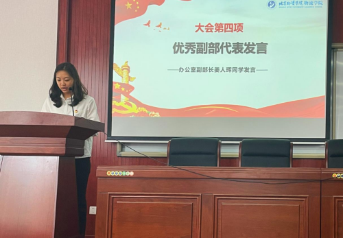 随后进入大会第四项,由优秀副部代表姜人珲同学发言。姜人珲同学向大家分享了自己的工作经历,并表达了自己对近一年来帮助、勉励自己的老师同学们的感谢。她认为在办公室任职,不仅充实了自己的课余时间,还结交到了许多志同道合的伙伴,在工作中加深了对身边同学们的了解。天高任鸟飞,海阔凭鱼跃。姜人珲同学勉励大家应继续在分团委学生会中发光发热,继续贡献自己的一份力量。