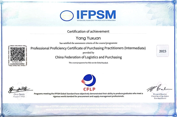 采购管理专业2023届26名毕业生,取得国内第一批国际采购与供应联盟(IFPSM)国际采购标准认证的证书。同时,26 名毕业生也取得了采购师职业能力等级认证(CPCP)中级职业资格证书。采购管理专业学生的国际采购与供应联盟(IFPSM)国际采购标准认证的证书,经历了2021年准备阶段、2022年启动阶段、2023年考试阶段等3个阶段,证书过程长达3年,共历经8年时间。采购管理专业学生取得国际采购与供应联盟(IFPSM)国际采购标准认证的证书,即采购管理专业学生的知识、能力以及素养得到了国际采购与供应联盟(IFPSM)的认可。