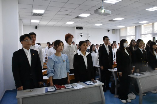 仪式开始,第一项全体起立,庄严肃穆,奏唱团歌。