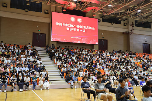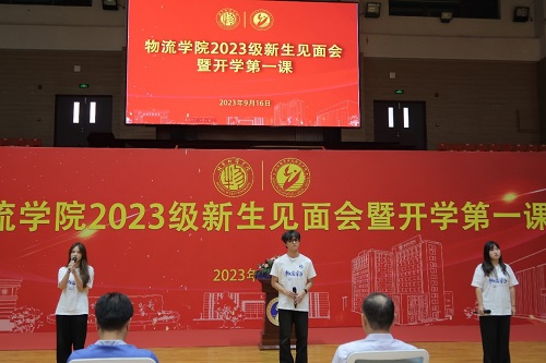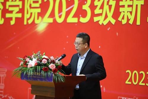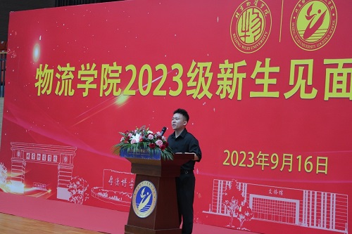 院长姜旭发表讲话。第一,希望同学们饱含敬畏之心,敬畏学术,敬畏专业,敬畏规则,敬畏生命。“敬”是尊重,“畏”是害怕,心存敬畏方能前行,希望同学们传承对学术的敬畏之心,扎实开展学术训练,奠定修身、齐家、治国、平天下的知识基础和思维能力,以思考型的心态去生活,相信学院提供的知识、能力、素养能让同学们受益终身,也希望同学们能够以学术之人格坚守青春之梦想。第二,希望同学们恪守自律。今日之学子身处世界百年未有之大变局,面对无尽的诱惑、躺平的颓废、内卷的焦虑、摆烂的心态,希望涵养自律品德,树立自律意识,追求自律生活,实现自律人生。希望大家不求举世皆醉、唯我独醒,但求大潮来袭时,选择站在理性的一边、文明的一边、人民的一边。第三,希望同学们保持感恩之心。感恩是一种智慧,大家要感恩父母、老师、朋友以及社会,珍惜学院优质的教学和科研资源,如国家级一流本科专业建设点、中国第一家国际采购与供应链联盟认证、与美、德、日等国外大学的学术交流,以及五个企业奖学金机会等,在感恩中前行。最后,姜院长用“你若努力,便是晴天”亲切勉励新生们尽快成长为优秀的物流人,鼓励同学们努力面对挑战、奋力创造未来。