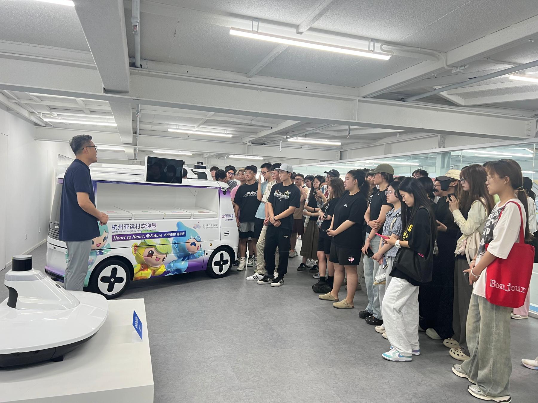 在杨锐经理带领下,师生参观了康盛工业园的整体布局,了解工业园的工作流程。杨锐经理详细介绍了公司当前最先进无人车设备的核心技术、性能指标、应用场景,尤其对共配中心的快递集单、自动化分拣、接驳以及配送等流程环节进行细致地讲解。随后师生和企业专家一起针对共配中心的业务流程进行了深入探讨交流。