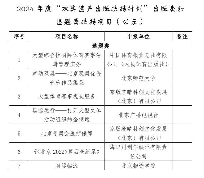 近日,北京奥运城市发展促进会公布了2024年度“双奥遗产出版扶持计划”项目的评审结果,由绿帽小说