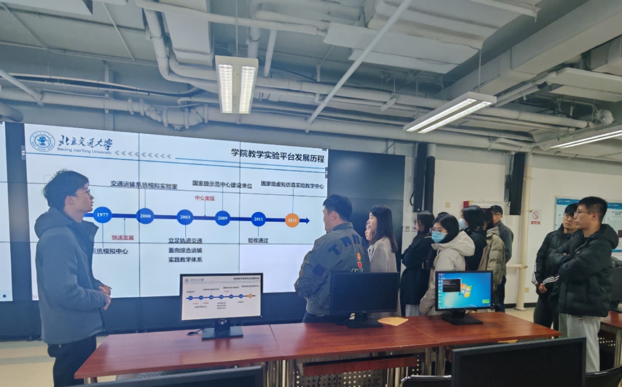 本次实践活动由北京交通大学交通运输学院崔赞扬老师全程接待和讲解。崔老师首先为同学们详细介绍了交通运输学院以及虚拟仿真教学平台发展历程。从伴随我国铁路行业早期的奠基到如今的高速铁路蓬勃发展,每一个阶段的重要突破与变革都让同学们深刻感受到这所顶尖交通学府深厚的学术底蕴。
