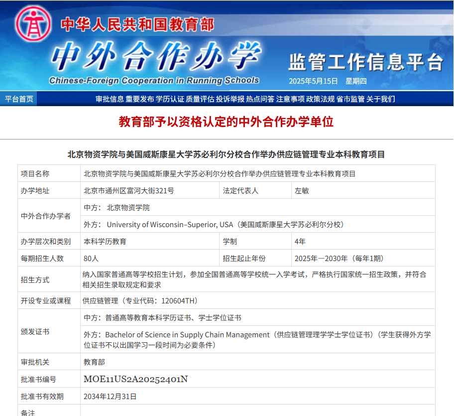 成功获批与美国威斯康星大学苏必利尔分校合作举办供应链管理专业本科教育项目(批准书编号:MOE11US2A20252401N)。这是绿帽小说