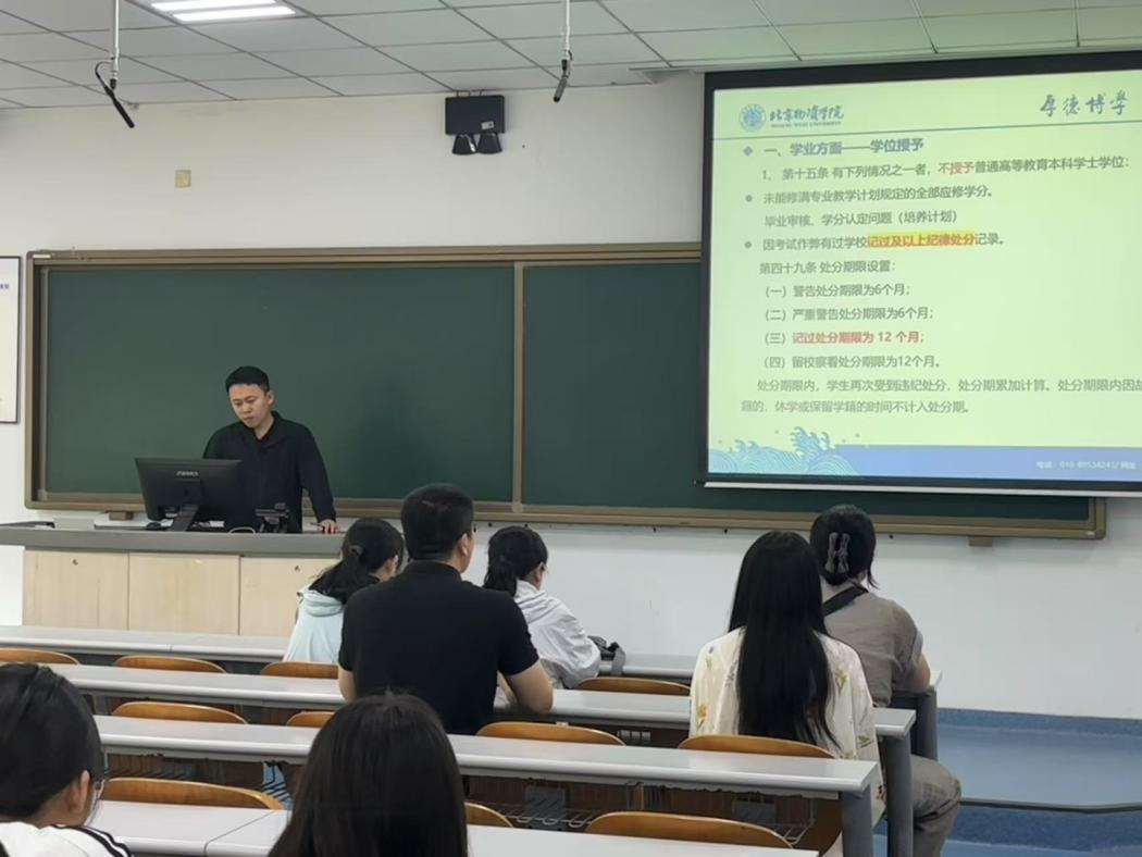 穆启鹏从学位授予条件、毕业生登记表填写规范及毕业活动规划相关事项等方面进行全链条解读。他特别强调,班级干部需化身 “信息枢纽” 与 “关怀桥梁”:一方面要精准传递毕业政策,确保通知 “零死角”;另一方面要聚焦学业、就业等特殊群体,依托党团班一体化机制,构建“精准对接、动态跟踪、全程护航”的工作闭环,全力保障毕业季各项事务高效、暖心推进。