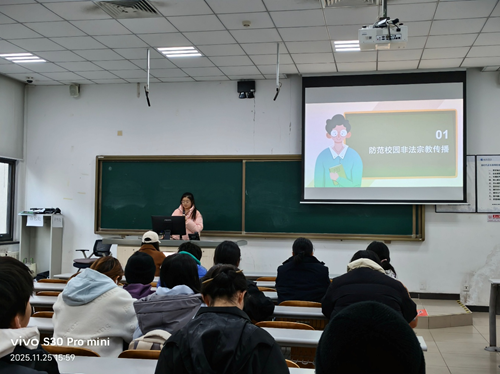 为了让同学们认清非法宗教的危害,守住思想防线,25级供应链1班常祎妹老师,使用通俗易懂的语言来解释复杂的理论知识,同时借助实际的案例以及校园中会发生的实际情况,来给同学们解释非法宗教是什么、有哪些危害。常老师列举了最新的例子,如:有人打着““心理疏导”等理由搞非法传教,并教大家如何一眼识别这些套路,遇到类似的情况应该如何应对、向谁求助。考虑到同学们的专业性质,老师还特意提醒大家以后走上工作岗位,可能会接触到更多的人和事,更要坚定科学信仰,树立正确的价值观,不能被非法宗教带偏。