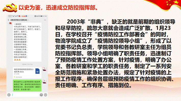 在学校党委领导下,迅速成立防控领导小组,建立微信群,点对点、点对面认真落实学校党委指令,积极做好宣传、统计工作,成效明显。