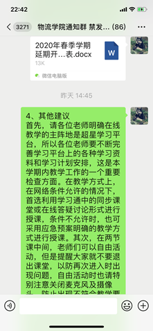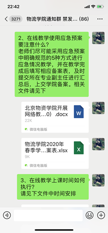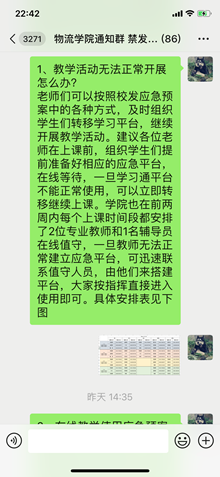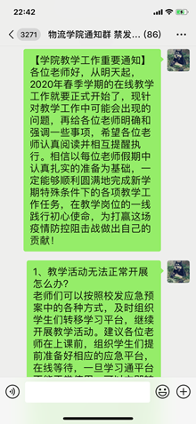 迅速响应,按照学校要求紧锣密鼓地开展了新学期在线教学的准备工作。学院结合实际工作情况,分别设立了课程教学等六个工作小组,分类管理、协同推进,细化工作方案、落实责任到人,提出了“一师一策、一课一策、一生一策”的教学管理和服务工作总方针。学院教学管理和学生工作部门在例行组织的培训答疑活动外,还反复摸排了解教师和学生的特殊困难,对症施策,协调解决。针对教学活动中可能出现的突发事件,由教学副院长带队,每天每个上课时间段都安排两位有经验的专业教师和一位专职辅导员在线值守,落实应急预案。开学的前一天,还在学院微信群中对重点问题编写了工作指南,多措并举,有力地保障了开学第一课的有序开展。