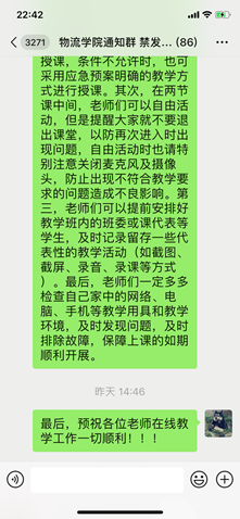 通过开学第一天的“云”教学实践,大大增强了老师和同学们圆满完成教学工作任务的信心。学院教学管理部门也将及时梳理总结教师和学生们反映的问题,保障后续课程的平稳有序开展。同时加强对在线授课中好方法好经验的宣传引导,充分发挥线上教学灵活多样、高效互动的优势,推动课堂教学模式的改革创新,真正实现在线学习与线下课堂“同质等效”。