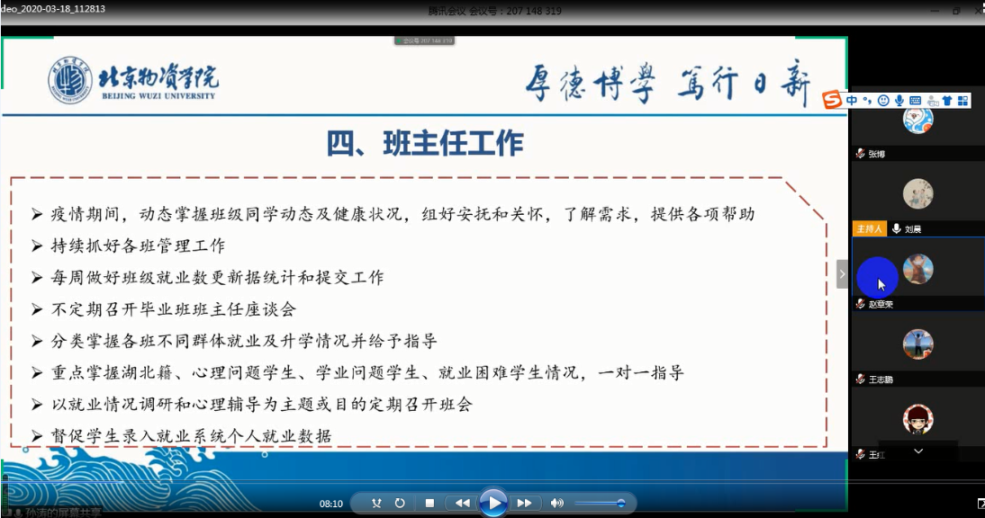 当前毕业生的总体就业情况,并介绍了近期为进一步做好毕业生的就业服务工作所采取的各项举措。毕业年级辅导员、就业辅导员、各班级班主任围绕当前毕业生的学业情况、考研考博情况、特殊群体学生情况、就业工作存在的困难等进行了补充汇报和交流。