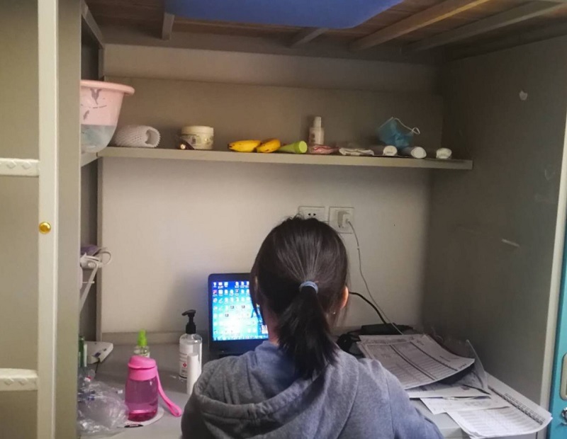 2030年2月2日她的年假结束,但疫情却还没有到转折点,实习公司应国家要求采取远程办公,她便在宿舍开始了每天按时上班、吃饭、休息的规律生活。又因为临近毕业,毕业论文和工作令她越来越忙碌,但学校对他们学习与生活的保障能够让她能静下心来准备毕业。学校老师们也经常看望留校生,带来慰问品,了解到她们的学习需求后,还帮助她们购买书籍,营造出温馨舒适的学习生活环境。