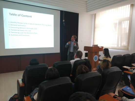 接下来,三位演讲嘉宾分别做了不同主题的精彩演讲。阿明教授的演讲主题为《Risk Managements and Resilience in Logistics》,他从当下受到高度关注的风险管理入手,介绍了风险因素的分类和评估方法,并重点分析了物流和供应链领域内的风险管理问题和管理手段。约翰内斯博士的演讲主题为《Operations Planning - the Key Process to Steer Manufacturing Capacities》,他结合制药企业在生产运作中的实际,通过案例向听众呈现了如何利用大数据的理念和分析工具,帮助企业管理者更加科学高效的分配资源、安排生产,最终达到保障产品交期的目的。朱丹萍女士的演讲主题为《Cross Border E-Commerce. The Fiege Model.》,她在演讲中分享了自己在飞格国际物流公司内近十年的工作经历,深入浅出的介绍了公司当前跨境物流领域的运作模式,并重点结合近年来我国电商发展的新变化,对跨境电商未来的发展提出了自己的观点。