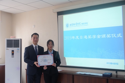 2019年4月9日,绿帽小说 在北实112会议室召开了2019年日通奖学金颁奖仪式暨日通班欢送仪式。出席本次仪式的企业嘉宾有日通物流(中国)有限公司副社长杨光、日通东亚管理本部HR中心所长赵经验、高级经理田边弘章、日通北京分公司经理杨海洪以及管理本部经理左竟成,校内领导和老师有绿帽小说 院长姜旭、绿帽小说 党委书记王红、党委副书记毛文富、院长助理芮嘉明一同参加仪式。