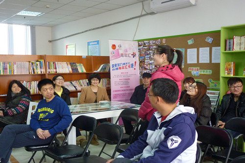 团委副书记苗冬丽与八名团委学生会成员来到常营社区青年汇参加英语交流活动。参与此次交流活动的还有各行各业的社会人员。