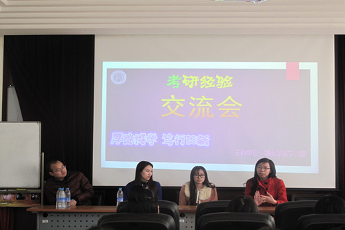 会议开始,毛老师和大家分析了近年来学校的考研情况,说明了举办考研交流会的目的,并结合自己的工作经验向大家讲解了考研的好处和必要性,尤其是对于外地生源,考研是很有必要的。随后,四位研究生分别和大家分享了自己关于考研的想法。刘莹莹学姐向大家介绍了自己当初的学习情况,并结合当时自己的备考经历,告诫大家一定要把握好时间、调整好心态,要选择自己力所能及的学校;张清楠学姐则着重向大家介绍了她的考研准备过程,并向大家推荐了一些不错的书籍;第三位分享的是王琦学姐,她的分享重点在于劝告大家一定要学会坚持,明白“胜者为王”的道理;最后一位陈建奎学长则强调一定要做好规划,充分考虑自己的实际情况,合理安排学习计划。分享完毕后,在学生提问环节,针对准备考研的学生提出的各种问题,四位研究生都根据自己的想法和经验认真地做出了详细的解答,再加上毛老师的补充,现场气氛热烈。