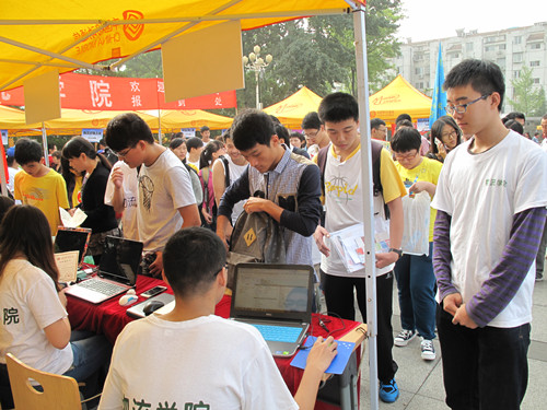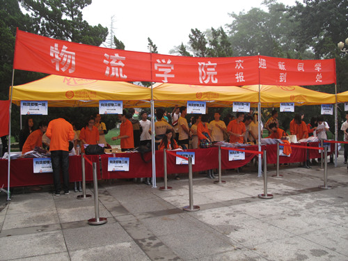 于主教门广场迎接2013届新生。早在前几天,学长学姐们就提前来校为迎新做了种种准备工作,在13日下午,已将场地基本布置完毕。
