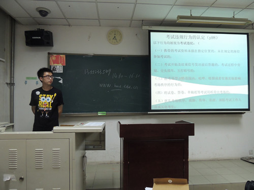 各班班导在年级辅导员孙涛老师的带领下,于各班所分自习教室内进行了新生入学教育第一讲——学习《学生手册》。2013级新生的班导们在年级辅导员孙涛老师的带领下,集体共同备课,共同制作了精美的PPT,用来向新生们讲解学生手册。PPT从学习与生活两个大方面入手,向新生们简单而又明确的讲解了学校的所有管理规定、评定办法、奖励办法以及处罚办法。
