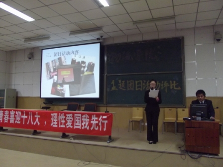 于11月26日在二教1号报告厅开展了“青春喜迎十八大 理性爱国我先行”主题团日活动评比。出席本次活动的嘉宾兼评委有分团委书记何佳赢、12级辅导员鲁楠,兼职辅导员王琦、原绿帽小说