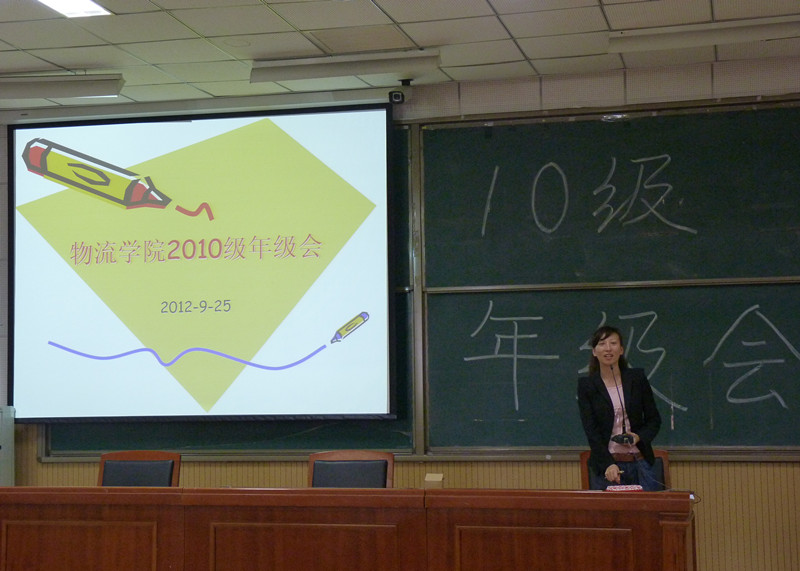 在二教第一报告厅召开2010级年级会,10级辅导员何佳赢主持全会,负责贫困资助工作的吕亚鹏老师参加了此次年级会。