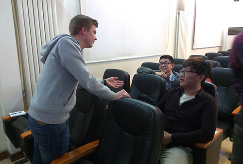的四名德国交换生:Nina,ToBi,Simon,Felix再次相聚在北实101。此项交流活动每周一次,已进行了数周,其目的是使本届的出国交换生们提前与外国人接触,更多地了解其他国家,也提高锻炼英语的口语交流能力。
