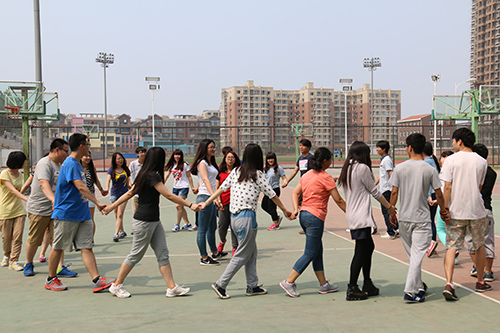 第二个游戏是考验团队凝聚力的风火轮。成员需要把报纸用胶条连成一个圈。每组选出四人进入圈内,如同传送带一般前进。从场地的一端走到一端,用时最少组获胜。第三个游戏是一块五毛,这是一个集体游戏。每个女生代表“一块”,男生代表“五毛”。当裁判报出一个价钱后,“一块”和“五毛”要迅速组合成这个价钱。而零散的“钱”就要面临淘汰的结局。“一块”和“五毛”们在场地中央围成一个圈。指挥者喊出了“一块五”,场上顿时沸腾了,“一块”开始寻找“五毛”;有的三个“五毛”组合被硬生生地拆开;两个“一块”抢一个“五毛”。这是一场脑力与体力的较量。第四个活动,顾名思义,即小组人员背对背将手互挽集体起身完成后再进行跳长绳,用时短组获胜。
