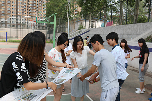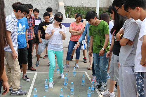 活动主要由四个小游戏组成:地雷阵、风火轮、一块五毛、坐地起身+跳长绳组合。活动开始之前,所有成员被分为四组。所谓地雷阵,即在一条布满障碍物(矿泉水瓶)长约6米的道上,每组选出一名学生戴眼罩在组员的指导下过障碍物,碰倒一个水瓶加10秒,到达另一端线后换人再原路返回,用时最少组获胜。游戏开始前,大家都纷纷聚在一起商量节时对策。裁判一声令下,参赛者出发了,迈着小心翼翼的步伐,生怕碰倒了水瓶,有的则是以破竹之势迅速跑到端线的另一边。天气虽然炎热,但这一点也没影响大家活动的热情。