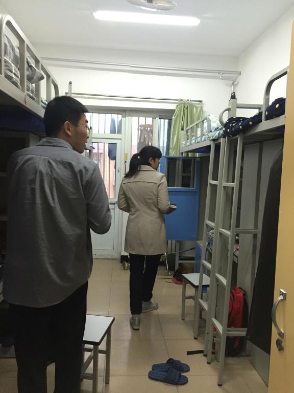 两个年级的辅导员在记分员的带领下走进了本年级男生、女生的宿舍,在一间间宿舍检查的过程中,辅导员都会一一进行点评,并与在宿舍的同学进行交流,包括近期学习、生活情况,叮嘱他们要注意用电安全、严禁在宿舍内吸烟等。本次查卫生活动,拉进了老师与学生之间的距离,更让大家有意识爱护宿舍卫生。