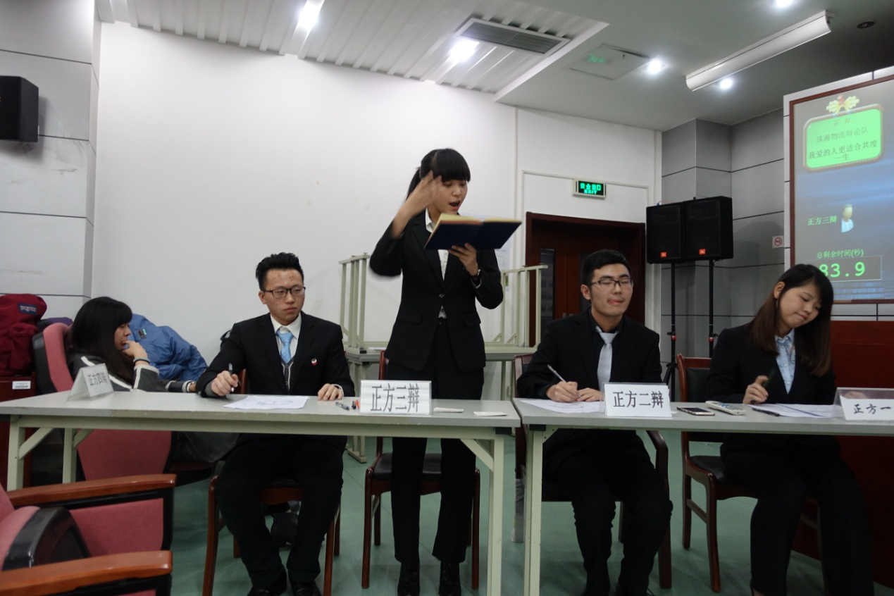 珠海代表队上场的选手有:一辩柯翠玲,二辩张森,三辩余清扬,四辩罗文正;物流辩论队上场的选手是:一辩林洁茹,二辩顾天任,三辩杨亚楠,四辩王思涵。双方辩手在握手认识之后,比赛正式开始。本次比赛中,珠海分队所持的是正方观点:我爱的人更适合共度一生,物流辩论队所持的是反方观点:爱我的人更适合共度一生。