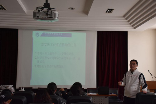 党委副书记毛文富总结了2015-2016学年秋季学期的工作和成绩,主要围绕学工队伍建设(包括学工人员情况及学生人数)、学生党建工作、就业工作及贫困生工作五项内容展开。此外,毛文富还强调了三项需要班主任重点展开的工作,包括每月召开主题班会、每学年至少对班级学生深度谈话一次及对特别学生及时反馈情况。