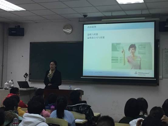 为质量管理工程专业为2016级新生进行现场授课。MS. Linda作为莱茵TUV集团首席运营官,同时兼任莱茵大中华区政府关系副总裁,具备多年质量检测、评估、认证、认可等行业经验,并且对于质量人才现状及发展趋势具有较强的市场评估能力。质量管理工程专业教师出席旁听了此次课程。