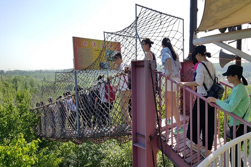 跟随向导的引领和一路讲解,同学们首先对整个农场园区的规模和经营规划有了大概的了解,步行千余米便来到了本次团建的第一个活动地点——“模拟红军长征路”。在这一项目中,老师和同学们要攀爬三段规格形式不同的绳索栈桥,每段栈桥都有对应的长征线路为主题,分别为:“瑞金开端”、“四渡赤水”和“激战腊子口”。在攀爬的过程中,老师和同学们往往需要手脚并用才能站稳在摇晃不定的绳索上,在通过一些跨度较大的踏板或低矮的通道时,还不时要测过身子一步一步的在绳索上腾挪或弓着腰深一步浅一步的艰难前行。
