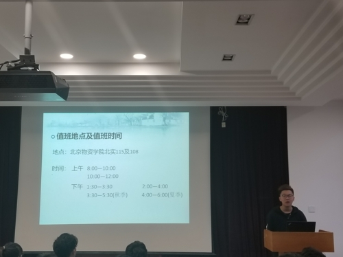 接下来则由办公室副部长王晨为副部们进行值班培训,主要讲解了值班时间、值班地点、值班事宜等,告诫各位副部不要在值班期间玩手机、打游戏,为师生营造一个良好的办公环境,并能协助老师完成相应工作。