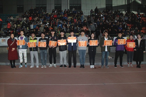 此外,运动会的趣味项目十人八字跳、企鹅步,增强同学们的凝聚力、向心力以及团结协作能力。尽管天气寒冷,运动员和观众们的热情只增不减,体现了当代大学生不屈不挠,顽强拼搏的体育精神。经过精彩的角逐后,物工三班荣获第一名,质管一班和物管一班紧随其后分别获得第二、第三名的好成绩。最后,朱晓婷老师和李思奇老师为获奖集体和个人颁发奖项并合影留念。