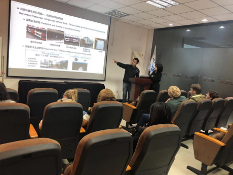 其次,学生们在公司报告厅听取了华人供应链市场部经理刘震对公司基本业务、服务对象及未来发展规划的详细介绍。通过刘经理的讲解,学生们了解到该公司是国内第一家具备医药冷链设施设备自主研发验证能力的物流与供应链企业。为更好地掌握运输节点的全程温度,企业于2013年着手建立环境温度大数据库;同时,基于成熟的TMS、GPS、APP等信息平台,企业能为客户提供线上线下不同方式的全程运输信息反馈服务,确保全程温度可视化。