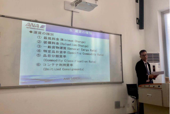 12月29日,在校内新建小院咖啡内部的多媒体教室中,第一届日通班的十名同学聆听赵经验总经理的授课。赵经验总经理结合当下时事,生动地分析法规对航空物流业的影响,让同学们更加具体地认识航空物流的方方面面。赵经验总经理系统地讲授了航空物流货物的分类、报价方法和报关的流程体系,指出了在不同国家文化环境下工作方式的不同,言语幽默,结合事例,给同学们留下了十分深刻的印象。