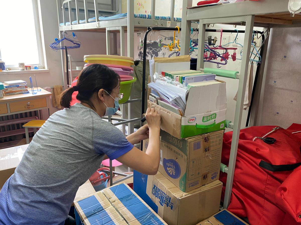 的老师们正式开始开展毕业生物品整理邮寄工作。每天早晨,都可以看到老师们手拿各类打包工具在宿舍楼门前集合。天气炎热,很多宿舍里不能开空调,甚至风扇也坏了,老师们带着口罩、手套,不断重复着弯腰直腰、蹲下站起的动作。尽管条件艰苦、工作量大,老师们并没有停止他们的工作,而是想尽办法,把工作做得更加细致到位。很多老师自己准备了密封袋、真空袋、软泡沫,用来打包水杯、电脑等易碎物品;有的老师研究出了物品打包的规律,通过不同形状的物品之间的适度挤压,形成牢固的平面,从而保证邮寄的物品安全性。连续的打包工作已经把老师们打造成了多面手,除了负责打包之外,老师们已经熟悉和掌握了行李的运送和邮寄过程,校门口经常看到老师们在等待自己的学生前来取件;三轮车、小推车、拉杆车等等,都成为了老师们得心应手的工具;行李统计表、运单统计表、行李交接表等等,成为了老师们每天必备的工作材料。看着老师们无怨无悔、连轴转的忙碌,学生们从最初的反对质疑,到逐渐接受认可,再到给出“五星好评”,甚至到最后的哽咽掉泪,许多同学们坦言:“之前对个人财物和隐私的顾虑和担心,都被老师们想在了前头,甚至比我们自己打包还要细致周到。”
