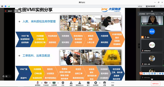 在具体讲到大田仓储物流管理案例之前,苏总介绍了VMI服务模式的简介,并用详细的流程图对企业使用VMI模式前后做了清晰的对比,随后列举了自己所服务的大田物流集团使用VMI模式前后的所产生的效果,其中涉及到了大田物流为北京现代提供的生产物流JIT和线边库存模式以及大田医疗器械仓配一体业务;最后给出了大田物流集团为什么要采用VMI模式的原因。板块一讲完后,苏总为启发同学们的思维,还留下了相关的课题供同学们课后进行研究,例如有:上游的供应商如何盈利?所有的供应商都配合VMI么?等四个课题。