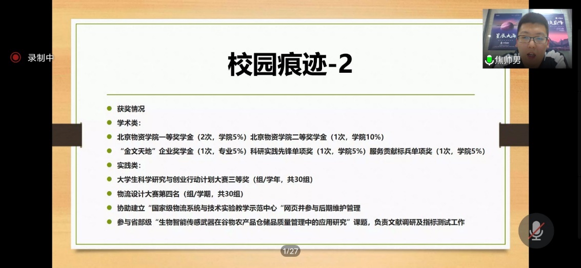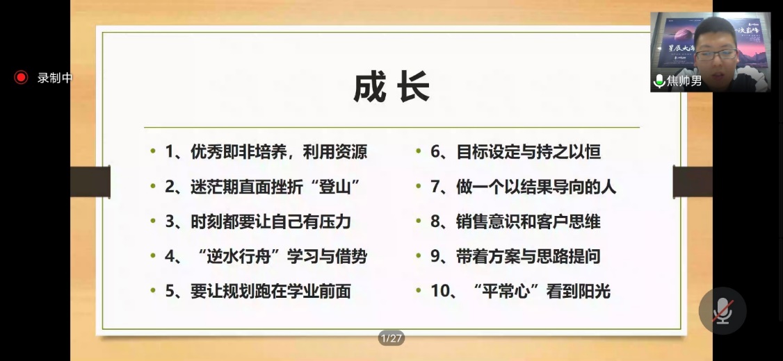 接着是焦帅男学长的分享。学长有丰富的校园经历,和成长心得。他着重为同学们分享了自己大学四年的成长规划方向。学长认为,首先应明确方向,主动有意地培养自己的各方面能力。合理借助教学资源,使自己成长更快速。大学四年要有战略性眼光,使自身能力的培养走在工作需求前面,有方向的培养自己能缩短与成功的距离。