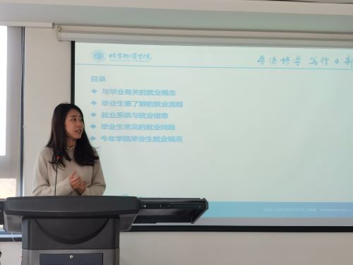 2017级辅导员甄姿针对毕业年级日常管理进行了讲解。各班级要做好信息传递与共享,及时关注学校各项通知要求,班委要及时向班主任辅导员汇报班级情况,发挥好纽带与桥梁作用,考研同学要多关注就业信息,保证完成毕业实习,丰富个人实习经历。