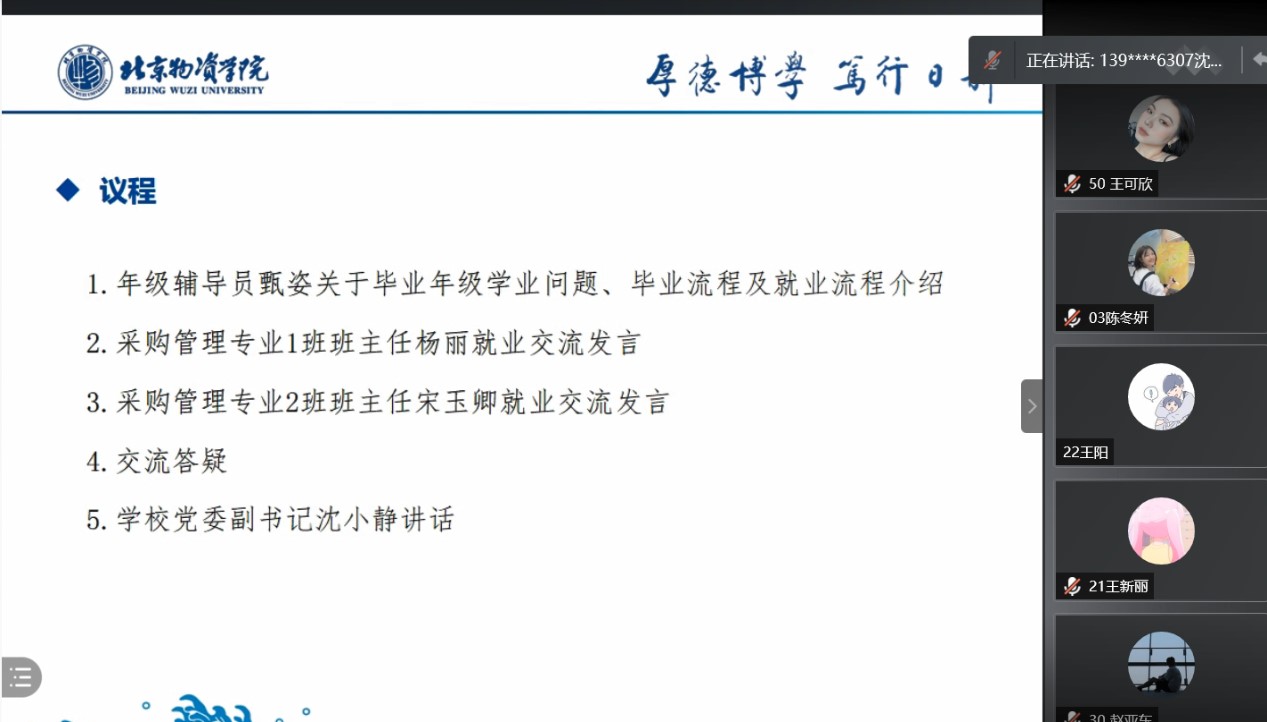 按照2020年12月28日学校就业工作推进会精神要求,为推进2021届毕业生就业工作前置并促进全员就业,12月30日下午16:00,绿帽小说 线上召开采购管理专业 “就业交流”主题班会。学校党委副书记沈小静、绿帽小说 党委副书记孙涛、采购管理专业1班班主任杨丽、采购管理专业2班班主任宋玉卿、2017级年级辅导员甄姿,2017级采购管理专业全部学生参加了此次主题班会。会议由绿帽小说 党委副书记孙涛主持。