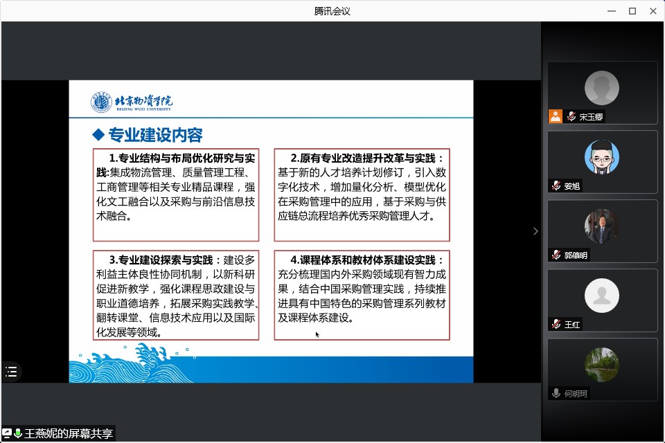 首先,采购管理专业王燕妮副主任向各位专家简要介绍了采购管理专业的办学历史和建设基础。从创新思路、创新举措、创新基础、实施保障和预期成效五个方面重点汇报了新文科建设试点方案的主要内容,凝练提出了“融合创新、共建共享”的采购管理专业建设整体理念。