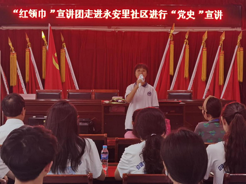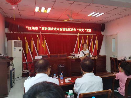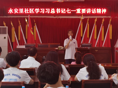 早上九点,暑期实践团的同学们来到天津市津南区永安里社区,聆听同学们所讲述的党史故事。在鲜红的党旗下,四位同学开始了他们的宣讲。