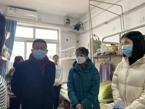 的领导和老师们与校团委书记张燕燕老师一同来到公寓楼,参观了志愿者的生活区域并与志愿者展开亲切交流。
